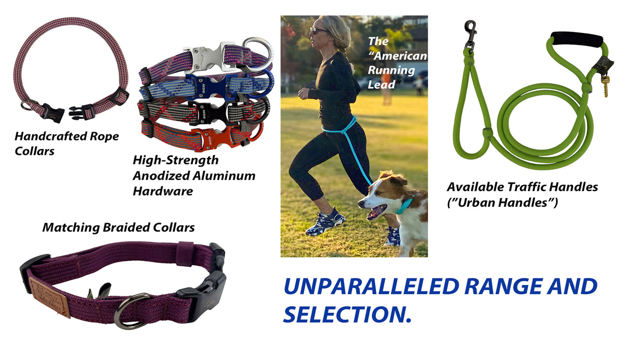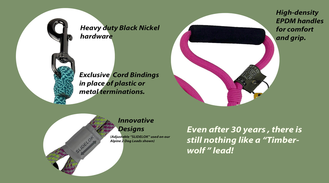 When Timberwolf set about making rope leads 30 years ago, there was literally one other mountain climbing rope dog lead on the market. It was manufactured overseas, limited to 3-4 color combinations, had large awkward metal terminations and had no other matching accessories. In over three decades in the pet business, Timberwolf has pioneered many improvements to that rudimentary rope leash. We developed and implemented our own unique cord binding to replace that large metal termination, added a custom, in-house manufactured, EPDM cushioned grip handle, increased the braid count to 48, developed our own proprietary flat braid material for collars and harnesses, vastly improved color choices and, ultimately, developed a full range of matching braided accessories to go with that leash. While the market has changed and there is a lot more competition, our product designs and improvements have stood the test of time and you will not find a another range of braided pet accessories that exude the quality and craftmanship of our products…all made right here in Colorado!